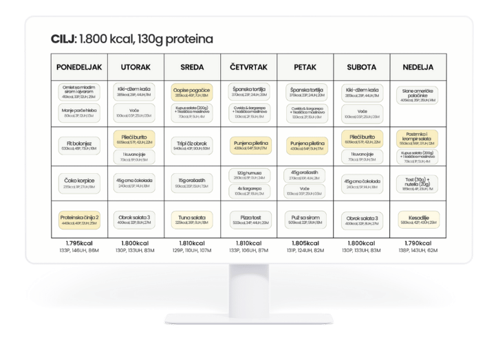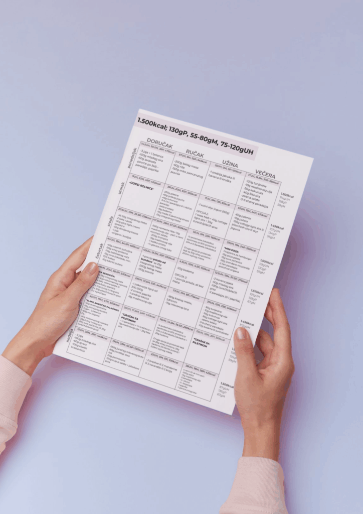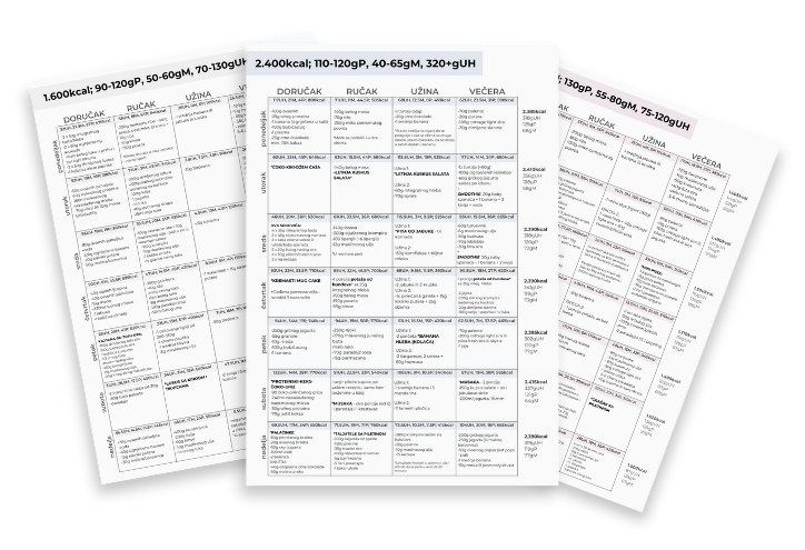 Svaki plan ima jasan raspored obroka i gramažu, tako da možeš odmah da ga koristiš – bez dodatnog računanja.