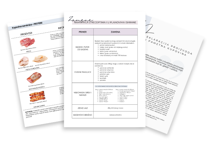 Ovaj deo e-booka sadrži jasno organizovan spisak namirnica po kategorijama – uz detaljna objašnjenja koje su nutritivno bogatije, koje možeš da kombinuješ i kako da prepoznaš kvalitetne proizvode po deklaraciji.