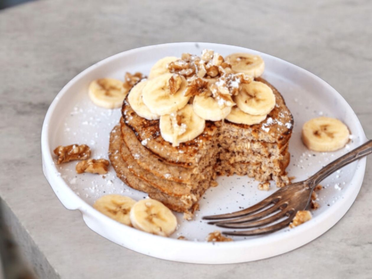 Ponavljajte ovaj postupak dok ne iskoristite svu smesu. Prelijte palačinke sa javorovim sirupom (može i med kao zamena), bananom i orasima.