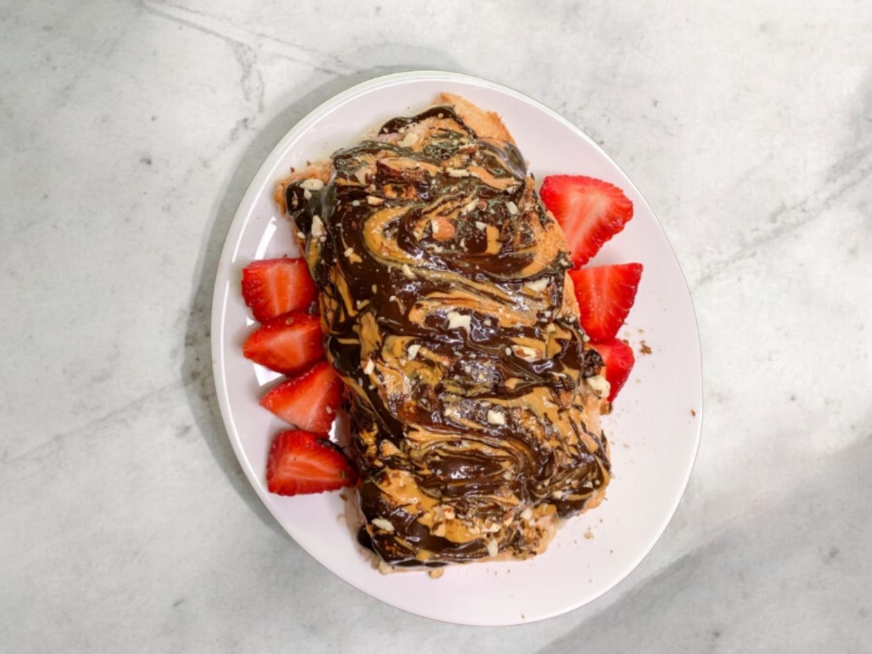 Kada je palačinka gotova, preliva se otopljenom crnom čokoladom, dodaje se kikiriki puter i malo izmrvljenih badema. Viljuškom se oblikuje preliv kako bi se postigao šareni izgled. Na vrh se obavezno dodaje voće, jer palačinka može biti malo teža, a voće će jelu dati lakoću. Preporučuju se jagode, ali se mogu koristiti i 50 g borovnica, malina ili kupina.