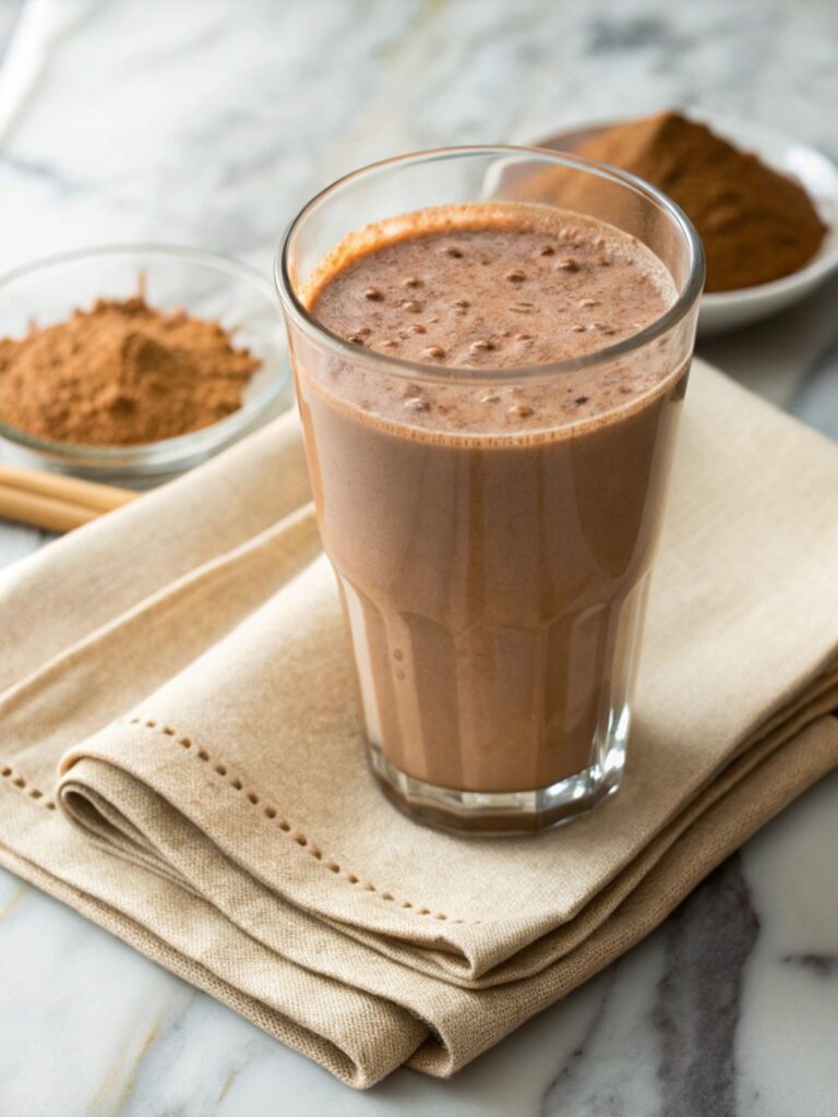 U blender stavite whey protein (idealno bi bilo da je ukus čokolada), sojino mleko (ili bilo koje drugo biljno mleko), kašičicu kakaa i kikiriki puter. Promešajte sve zajedno i poslužite u čaši.