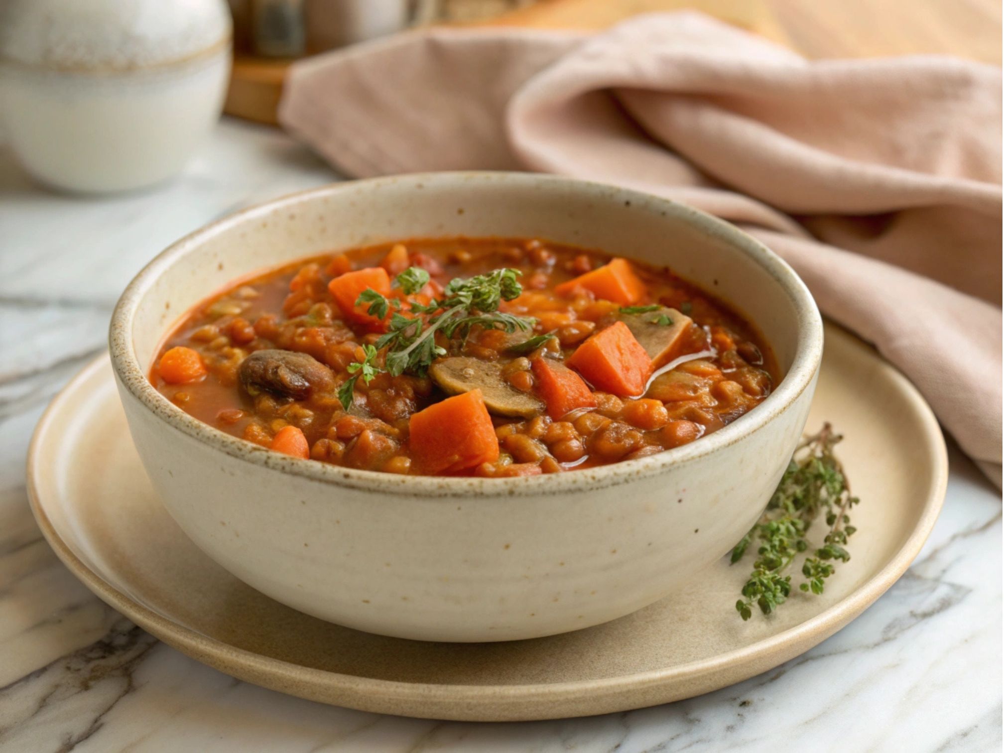 Dodati crveno sočivo i seckani paradajz iz konzerve, zatim sipati sok od paradajza i povrtni bujon. Smanjiti temperaturu i kuvati na laganoj vatri 20-25 minuta dok sočivo ne omekša i jelo ne postane gusto.
