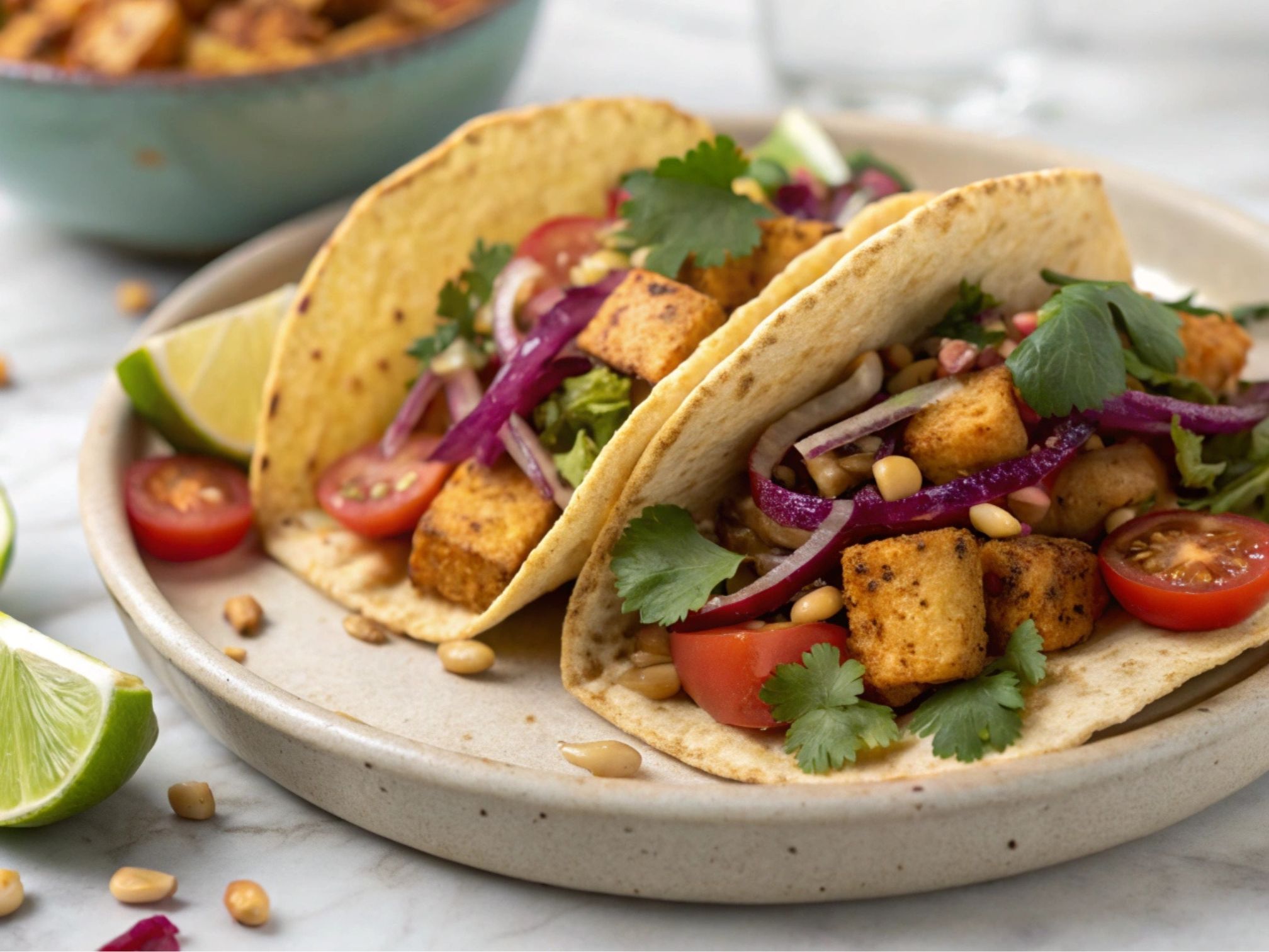 U suvom tiganju kratko tostirajte kukuruzne tortilje sa obe strane, dok ne postanu blago hrskave i tople.Na svaku tortilju stavite smesu od tofua i povrća, a zatim ih pospite svežim, seckanim korijanderom. Po želji dodajte dodatne prelive, poput veganskog jogurta ili ljutog sosa.