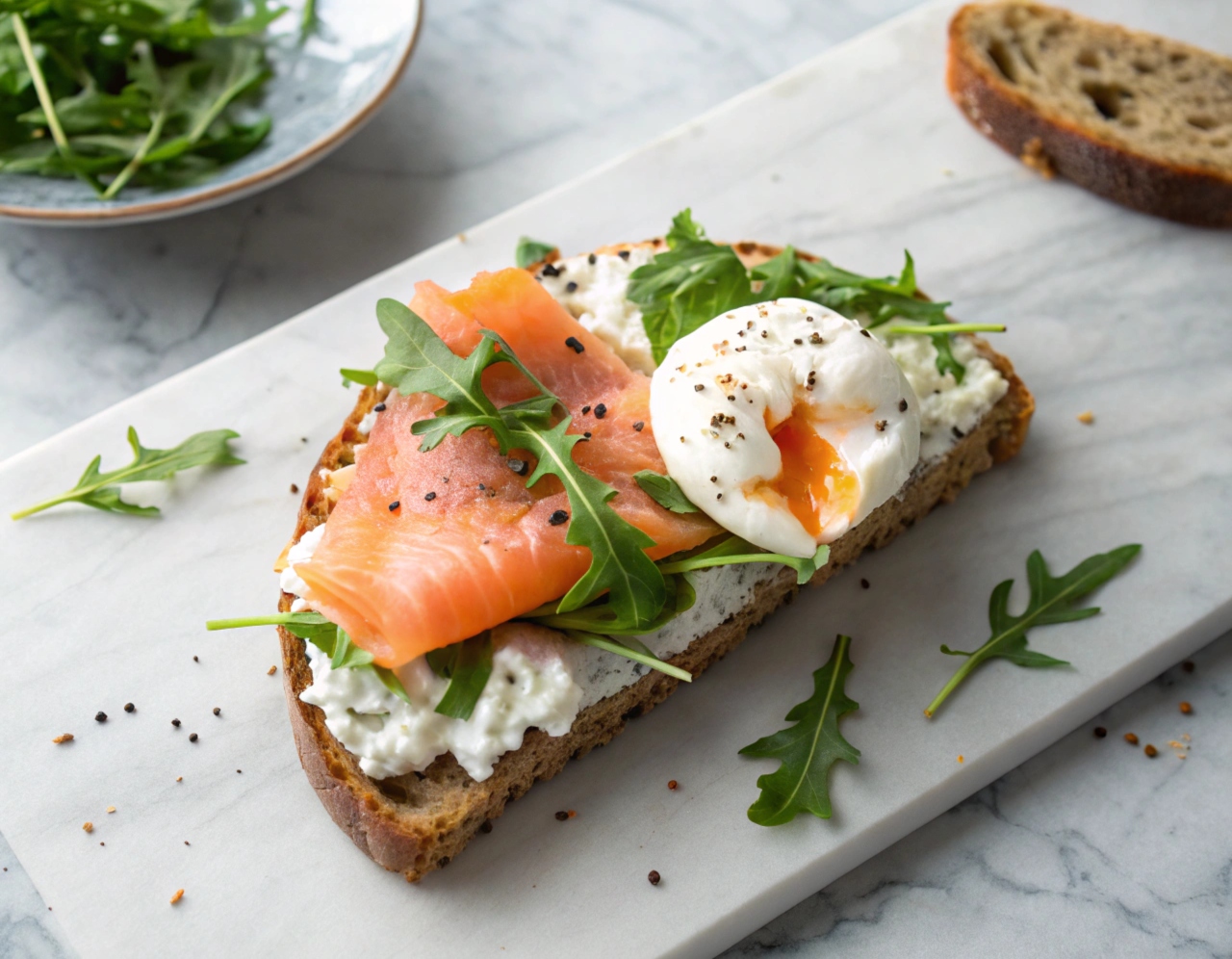 Preko namaza stavite dve šake rukole, dimljeni losos i jaje na oko (ili kuvano jaje ako to više volite). Na vrh možete dodati začine po ukusu.
